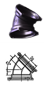 又稱為雙法蘭鑄鐵管件 - 45°彎頭, 雙承口45°彎頭,指兩端全部為承口,采用法蘭連接,B型膠圈密封的鑄鐵管件。 B型鑄鐵管和管件是目前國內(nèi)常見的連接方式,特別是在高層排水有更好的強度,地下排水中有更好的性能和優(yōu)勢。